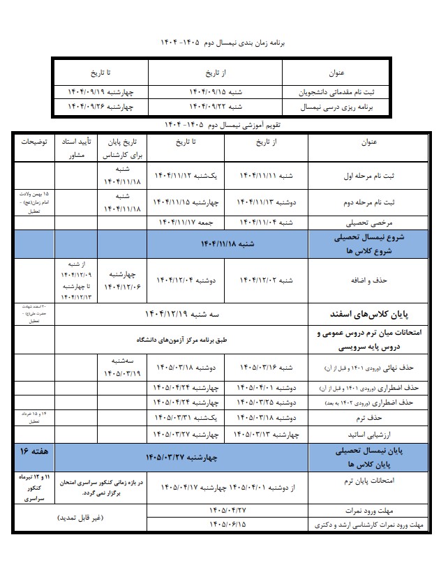 برنامه زمان بندی و تقویم آموزشی نیمسال دوم 1405-1404(به روز رسانی 4 تیرماه ماه 1404)