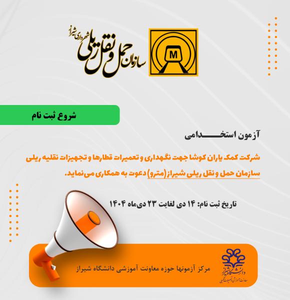 دانشگاه شیراز اقدام به برگزاری آزمون استخدامی برای تأمین نیروهای متخصص شرکت کمک یاران کوشا طرف قرارداد سازمان حمل و نقل ریلی شهرداری شیراز(بخش خصوصی) مینماید.